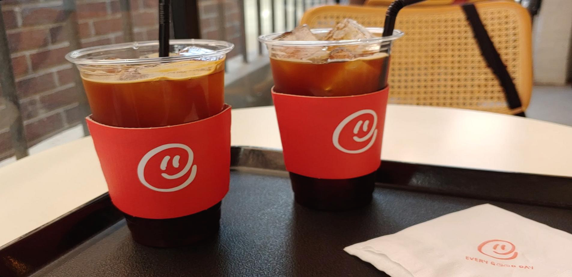 여기다! 하고 아이스 아메리카노 두 잔을 주문했다. 원두 선택이 가능하다. 하나는 듁스(Dukes)의 산미가 느껴지는 원두였고, 다른 하나는 카멜(Camel)의 다크하고 고소한 원두였다. 나는 듁스 원두를. 일행은 카멜 원두를 시켰다. 커피맛은 무난했구요. 저는 실내에 연결된 테라스에 앉았는데 다른 사람들과 공간이 분리되어 커피 마시며 대화 나누기에 굉장히 좋았습니다.
