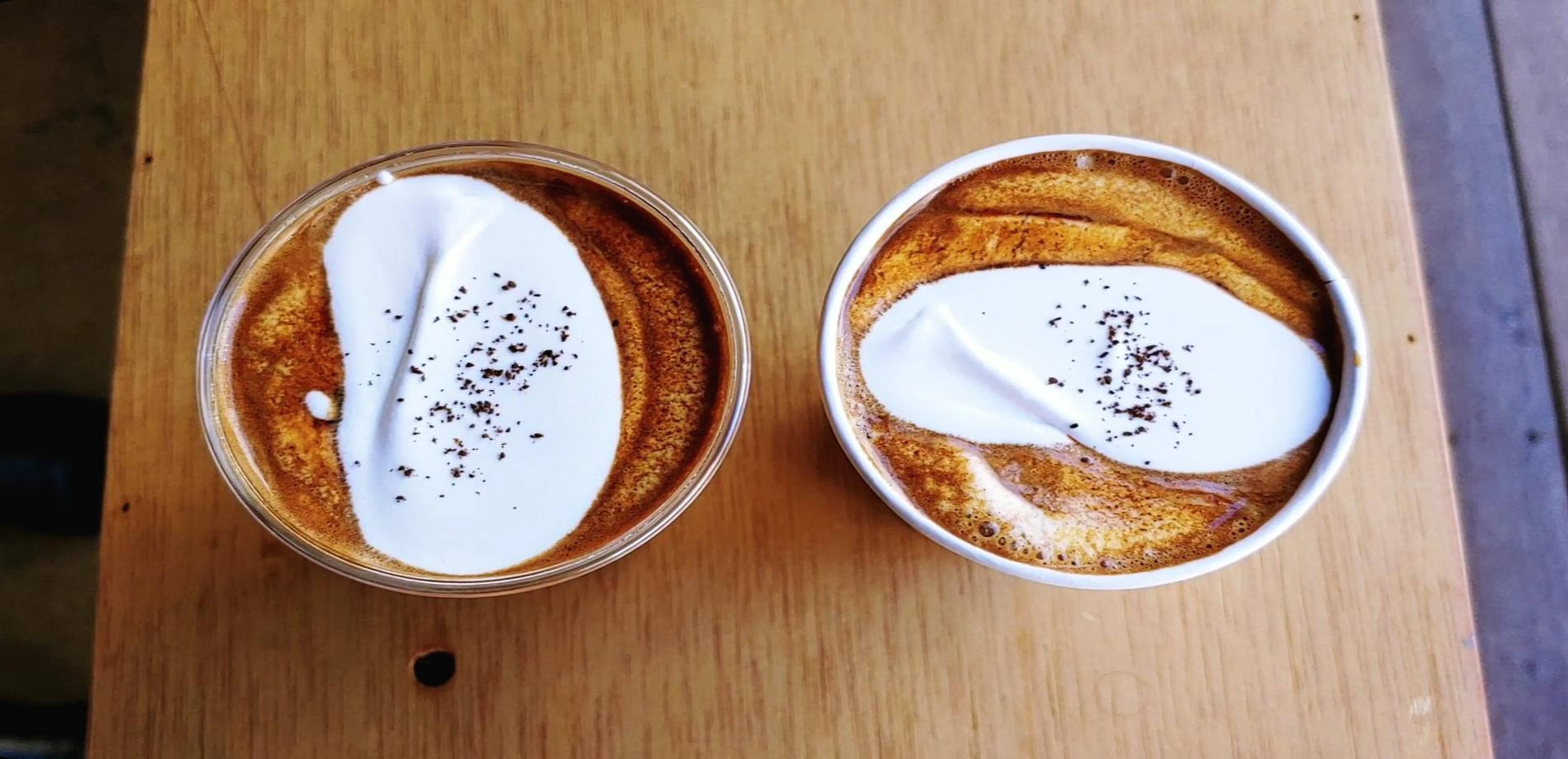 2번 아인슈페너를 나는 아이스로 주문하고 일행은 따뜻한 걸로 주문했다. 플라스틱 컵과 종이컵에 차이만 있을 뿐 사이즈는 동일하다.